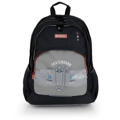 Hátizsák, iskolatáska, cipzáras, GABOL "Trick", szürke-fekete, gördeszka